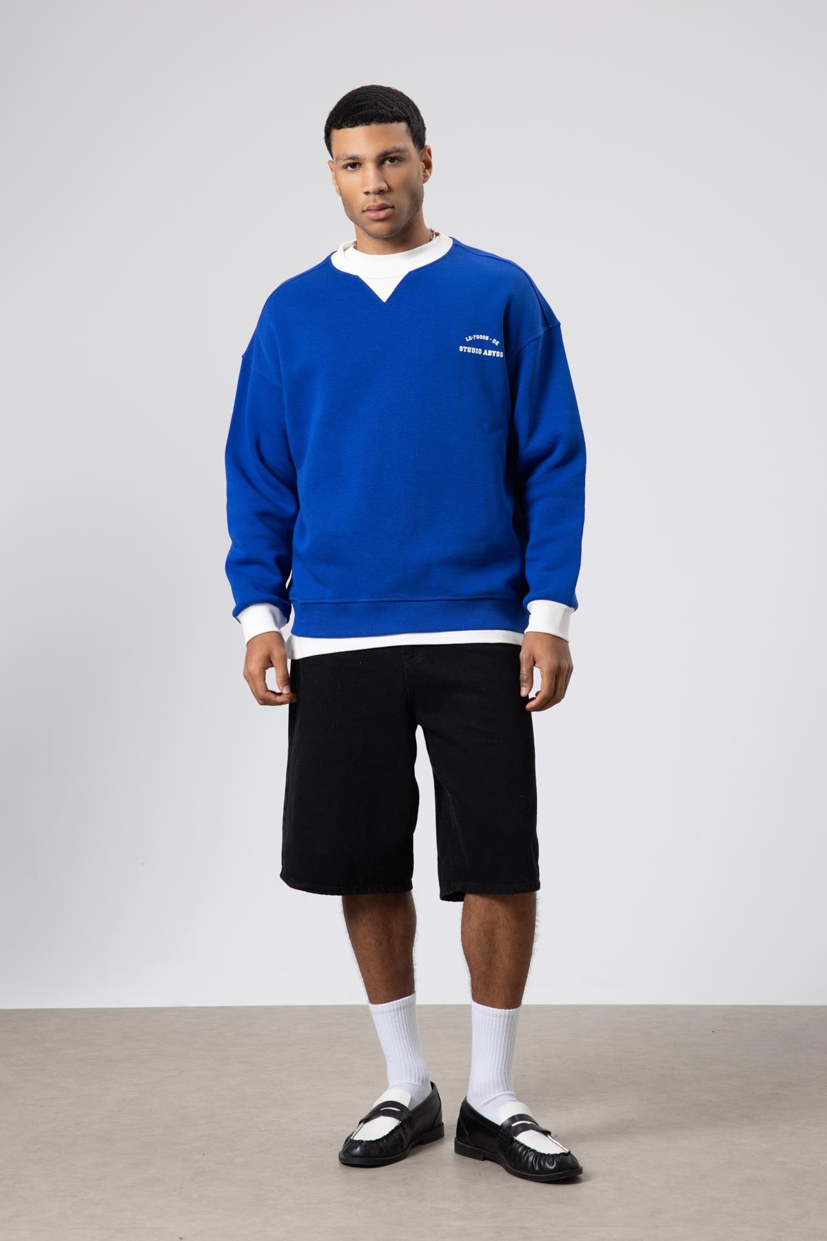 Oversize Bisiklet Yaka Baskılı Sweatshirt Saks (V70-91)