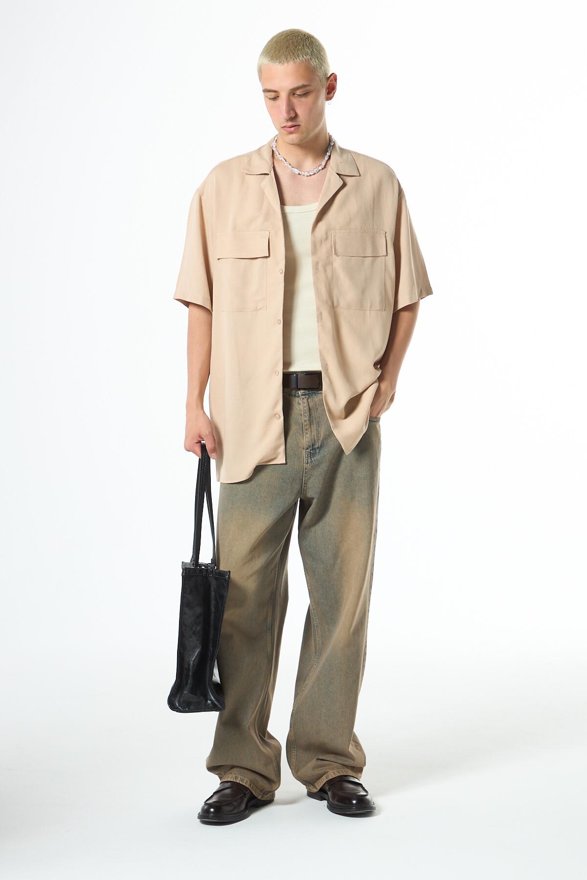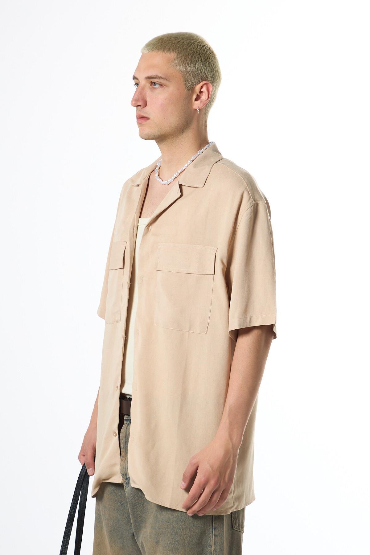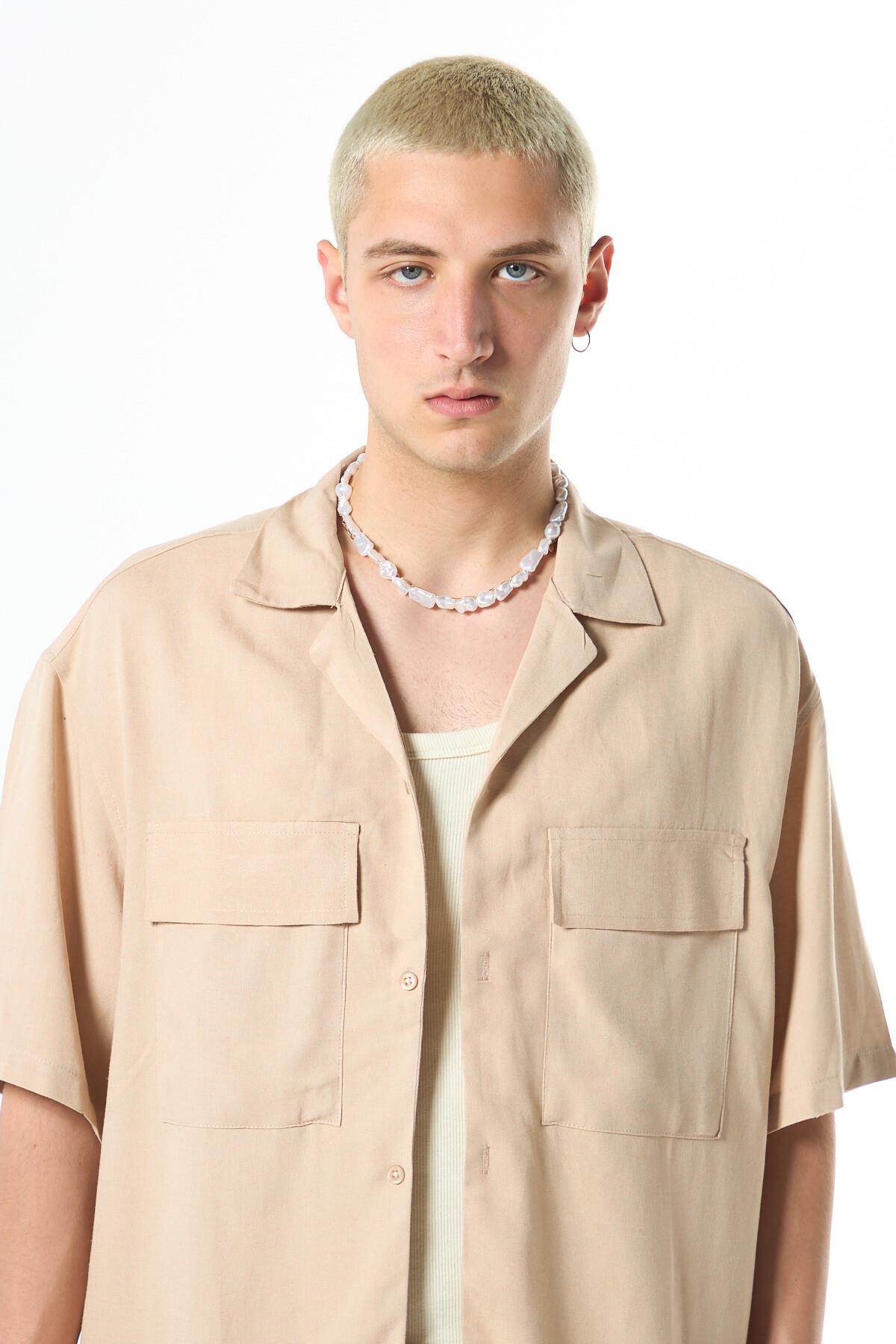 Oversize Çift Cepli Kısa Kol Keten Gömlek Bej (40-709)
