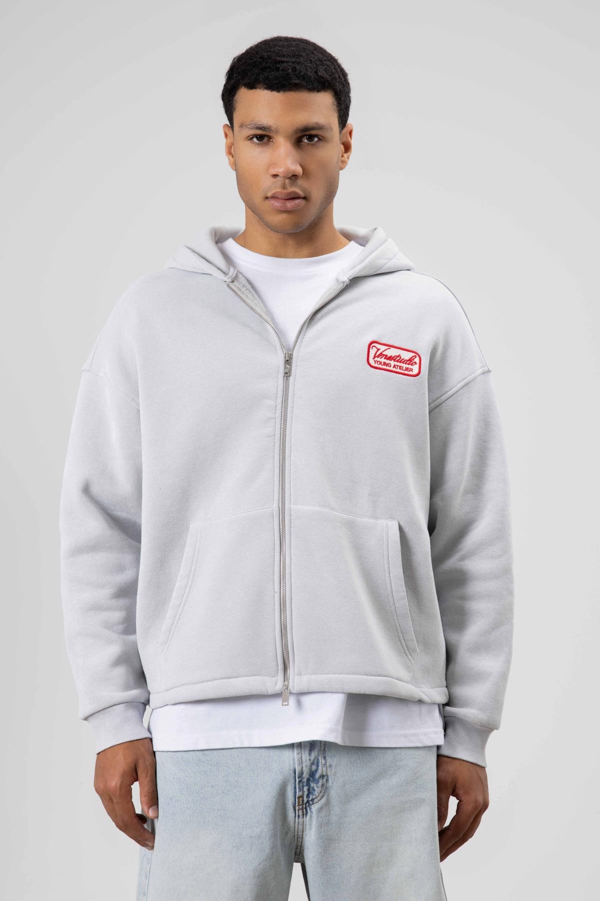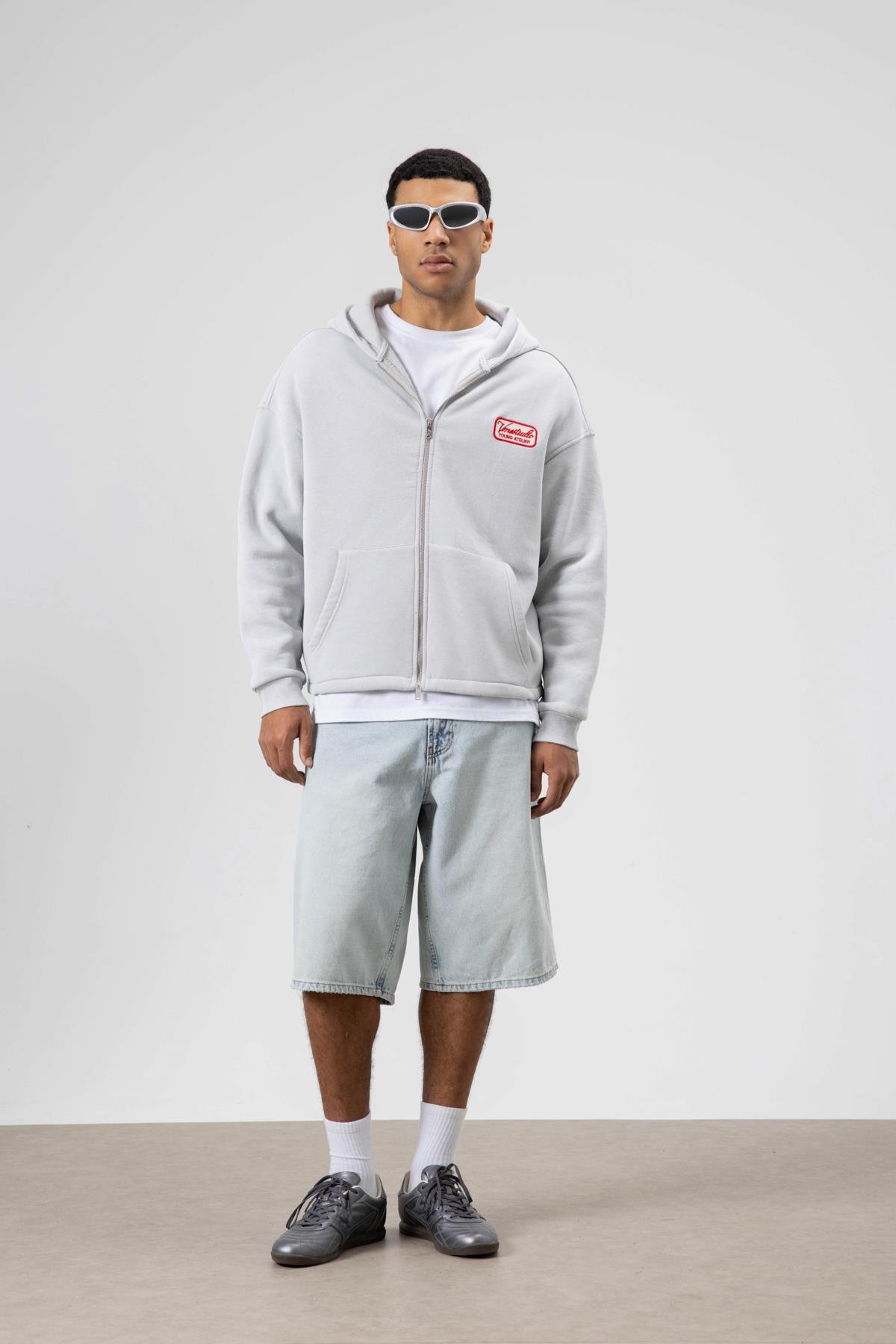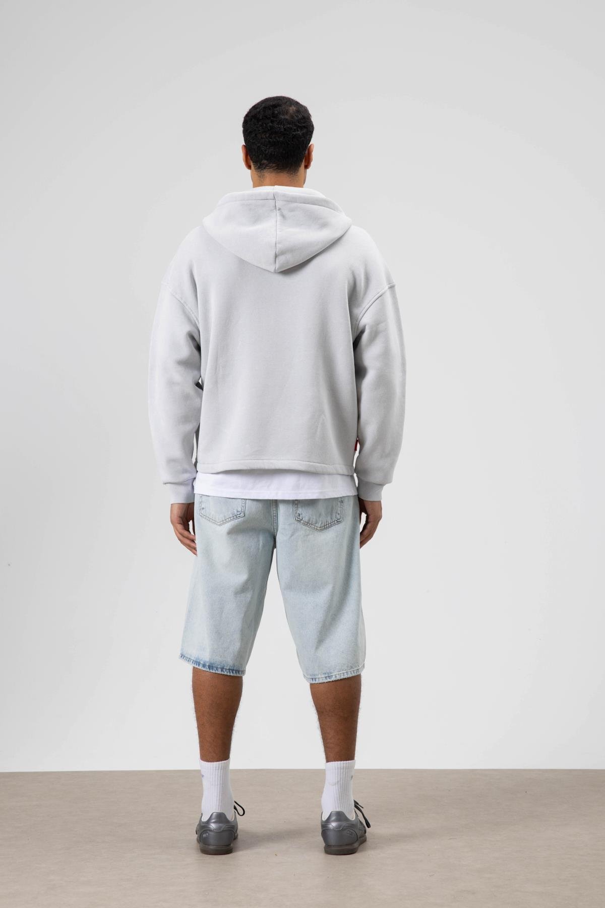 Oversize Fermuarlı Kapüşonlu Sweatshirt Açık Gri (V70-109)
