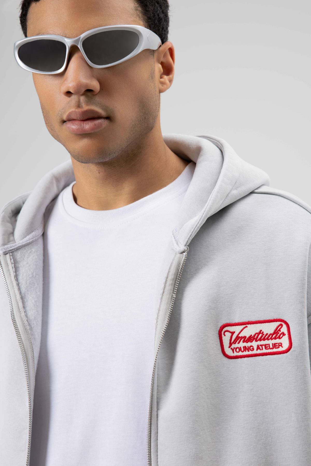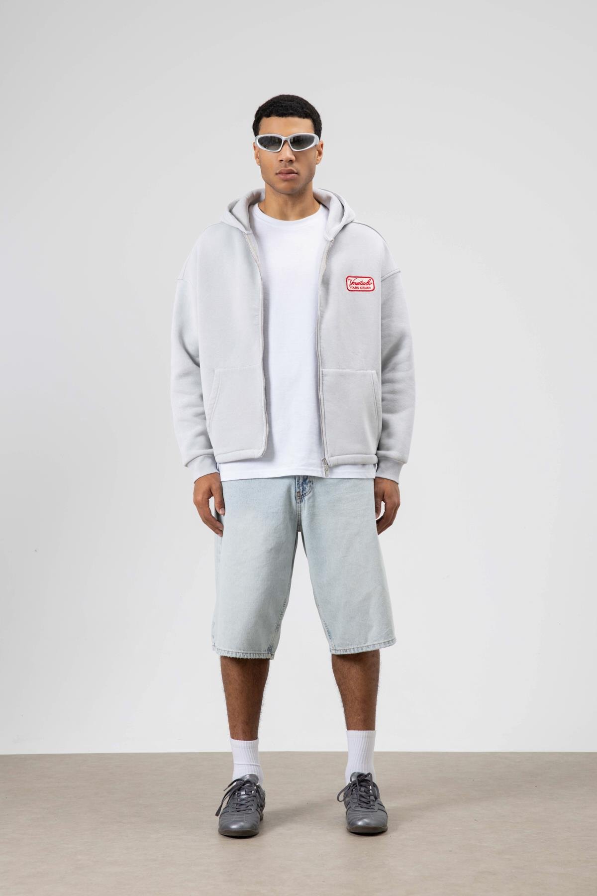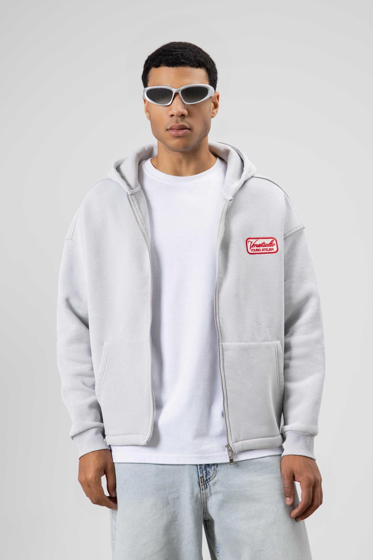 Oversize Fermuarlı Kapüşonlu Sweatshirt Açık Gri (V70-109)