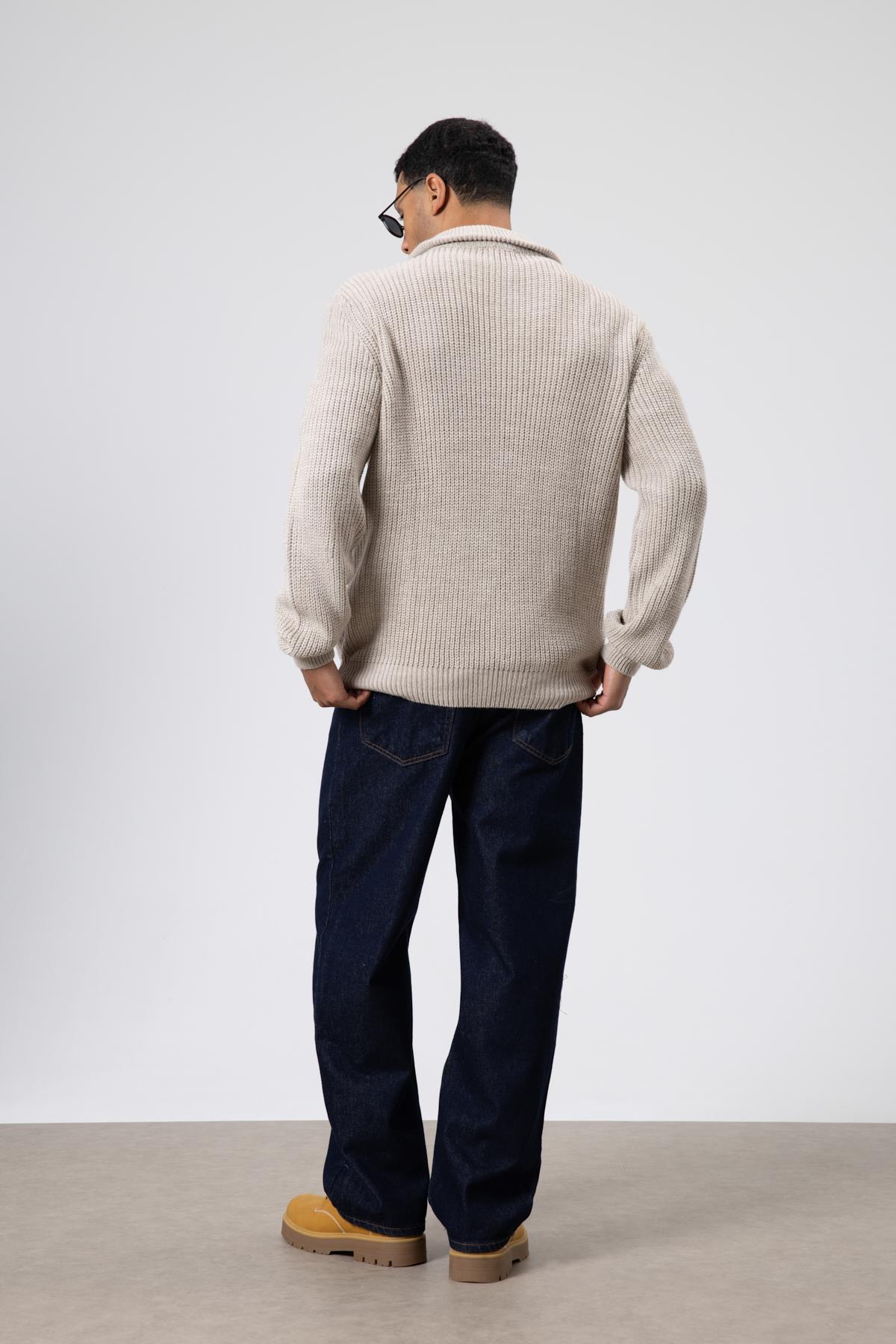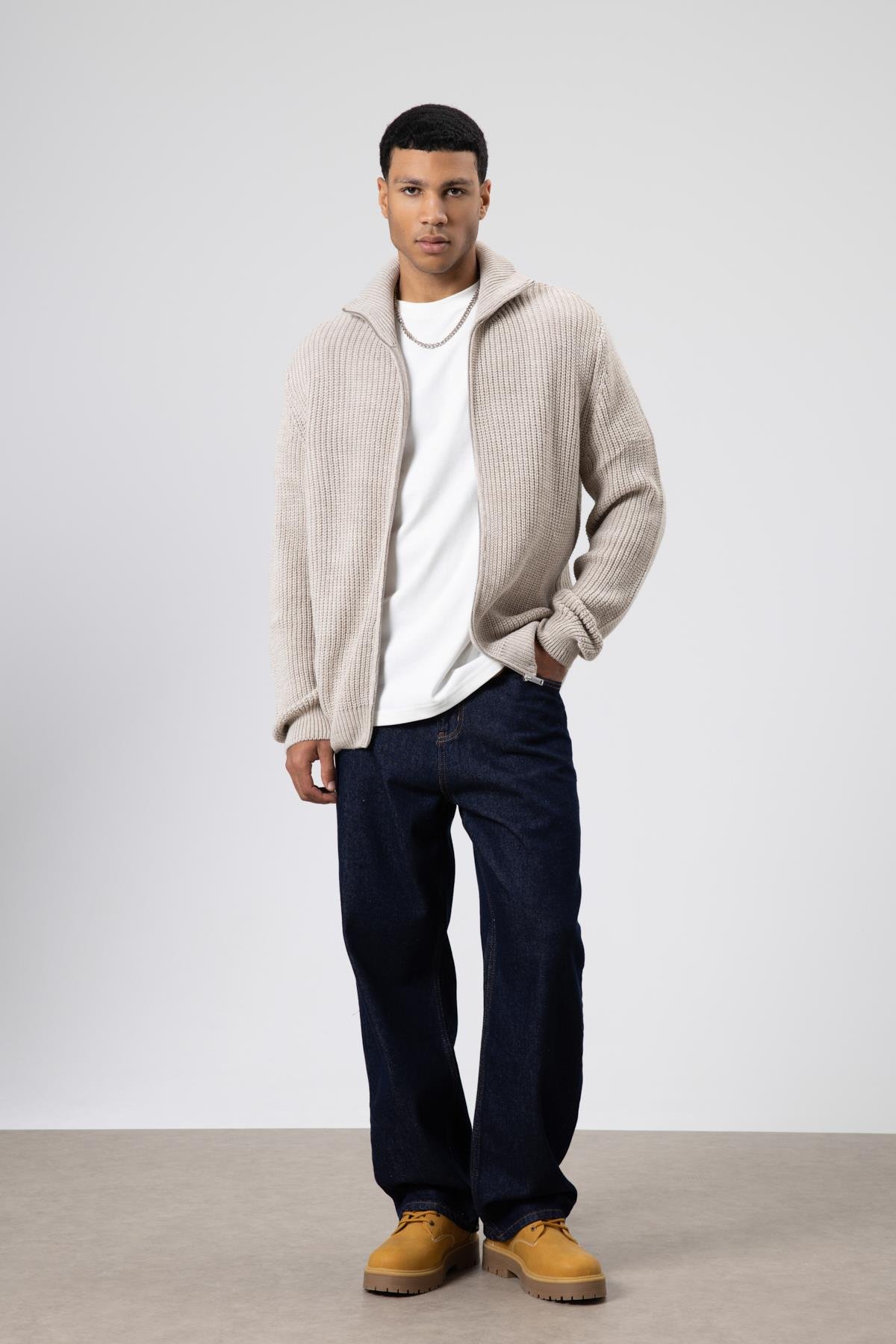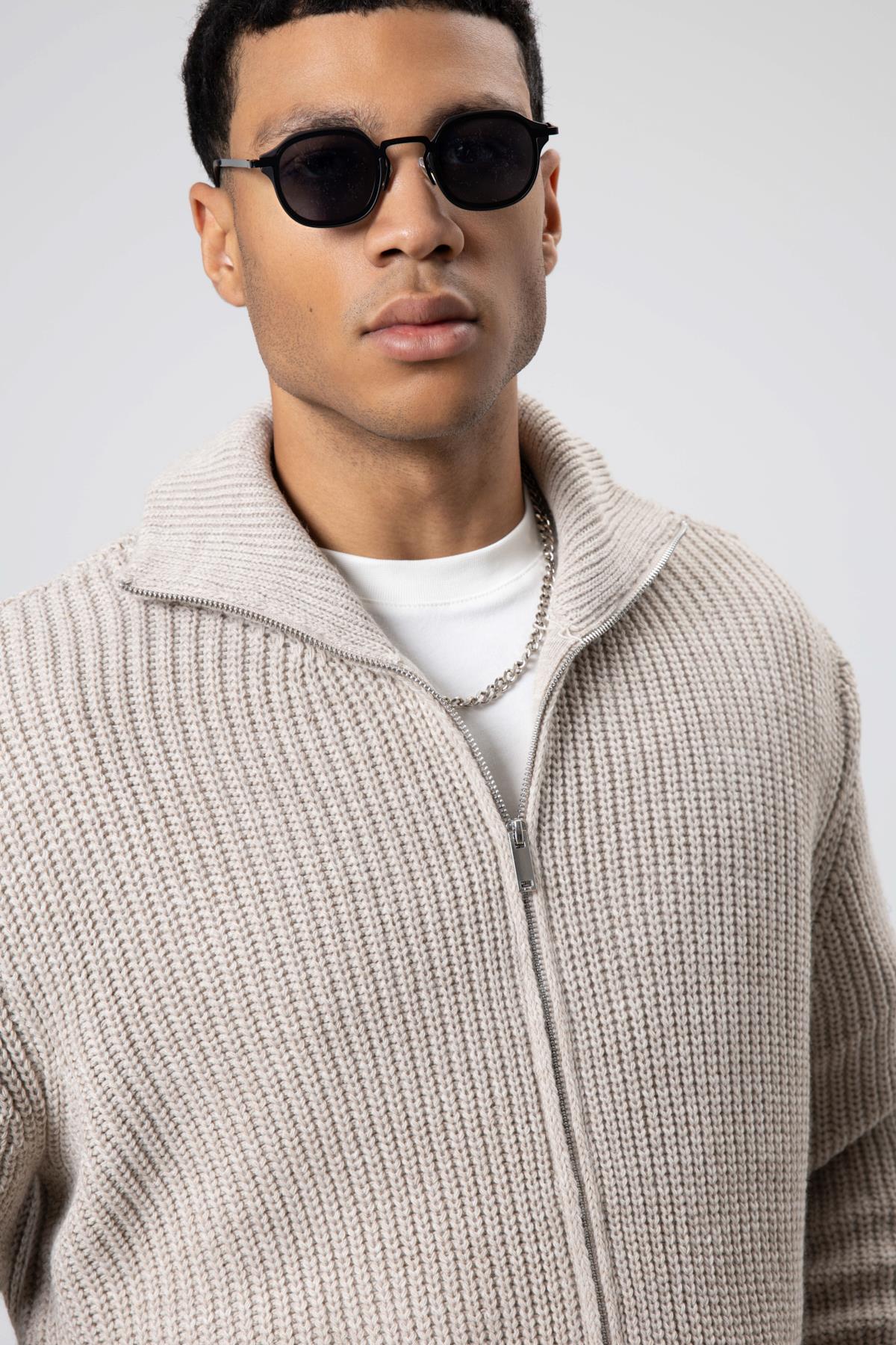 Oversize Fermuarlı Triko Hırka Koyu Taş (V60-14)