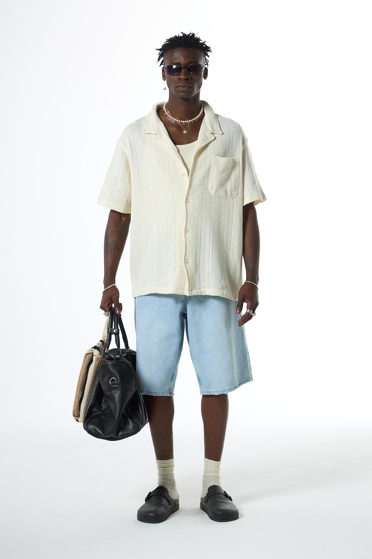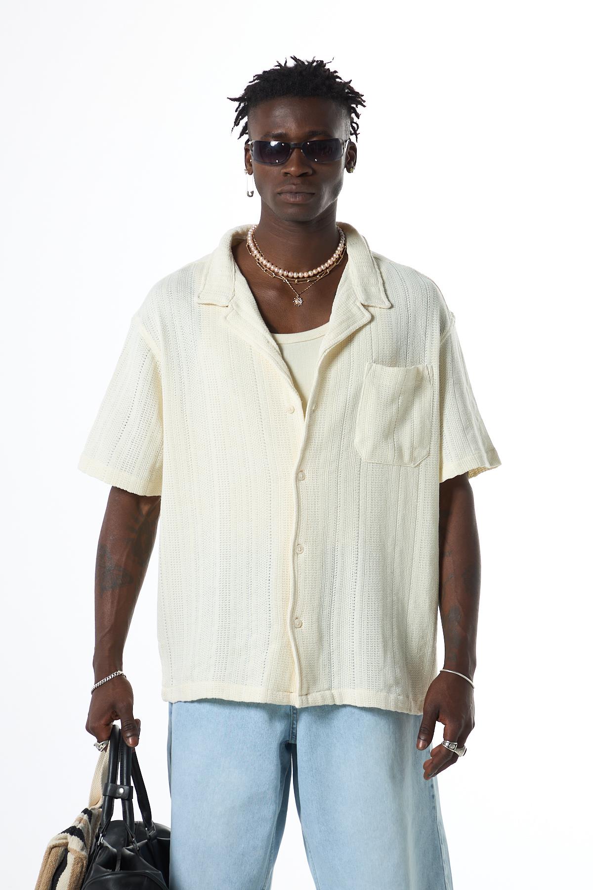 Oversize Kısa Kol Cepli Triko Gömlek Ekru (40-701)