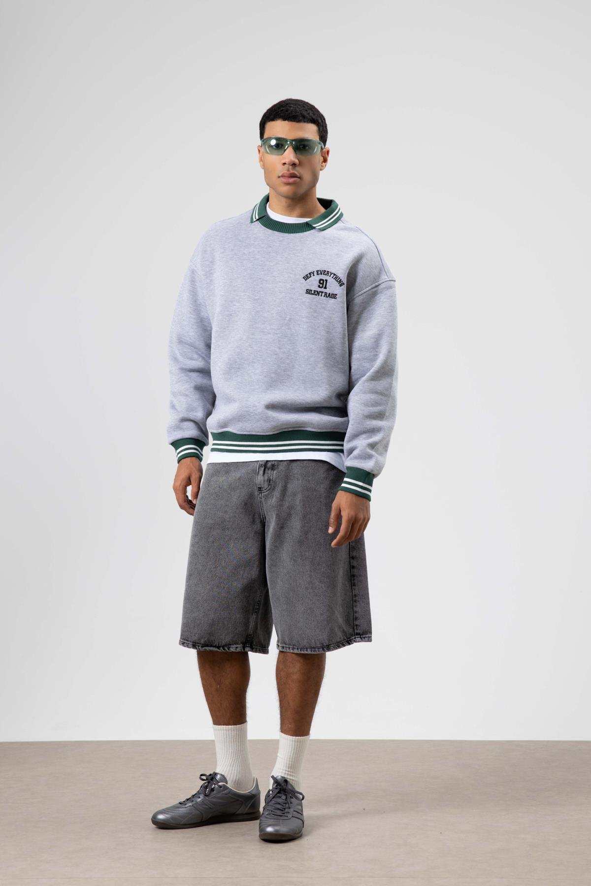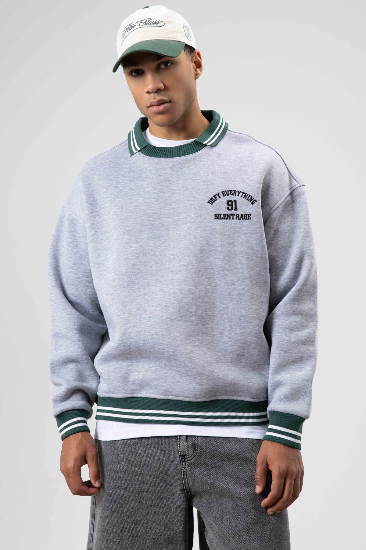 Oversize Yaka Nakış Detaylı Sweatshirt Gri Melanj (V70-110)