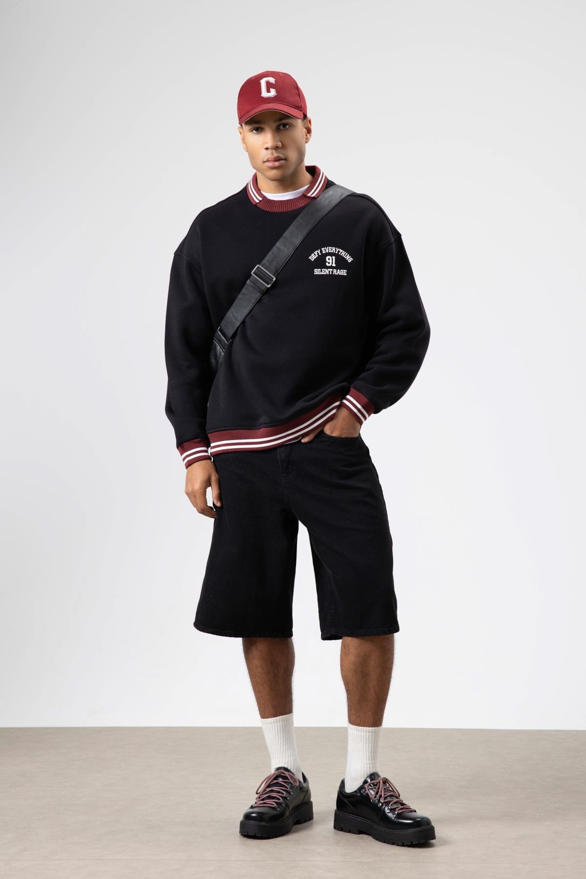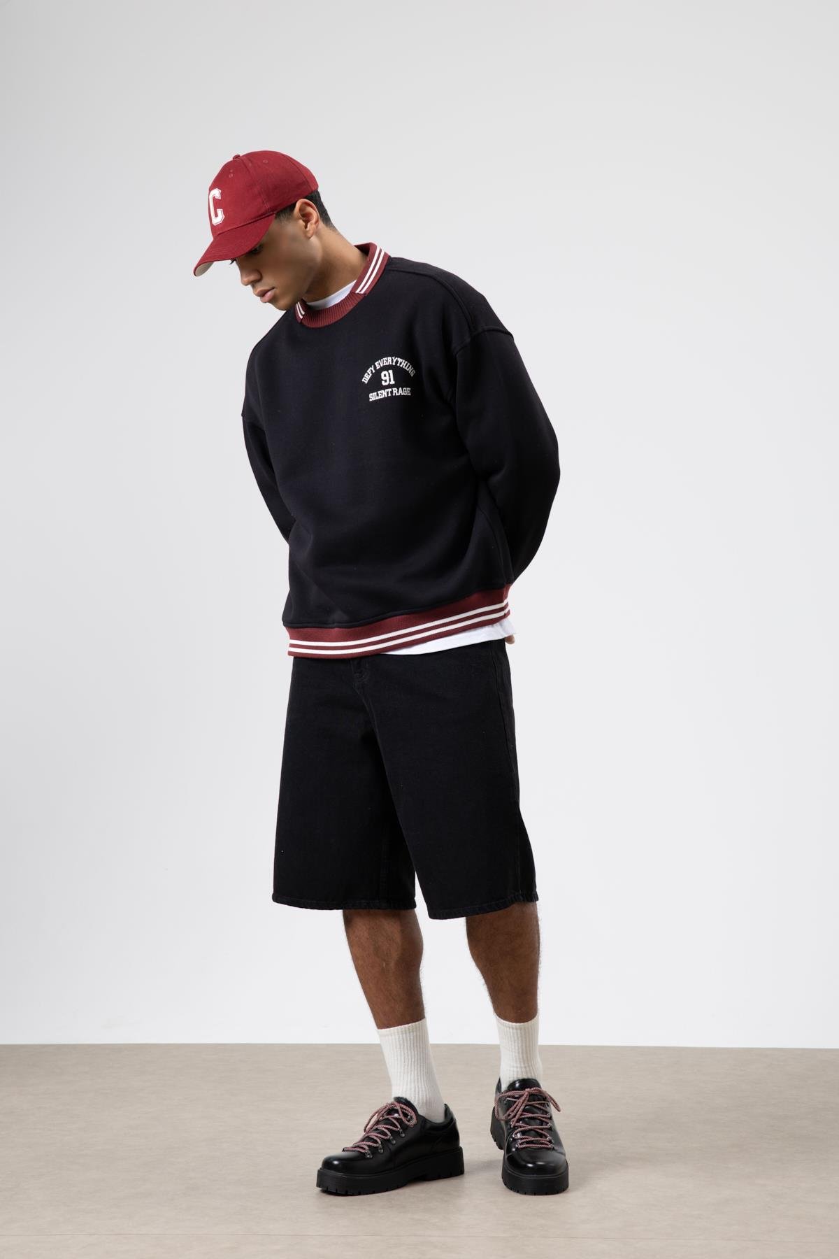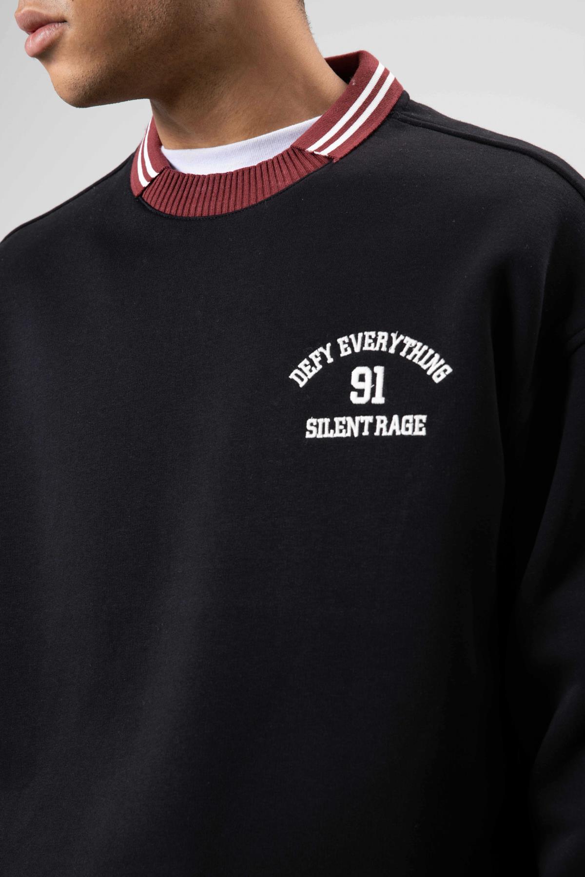 Oversize Yaka Nakış Detaylı Sweatshirt Siyah (V70-110)