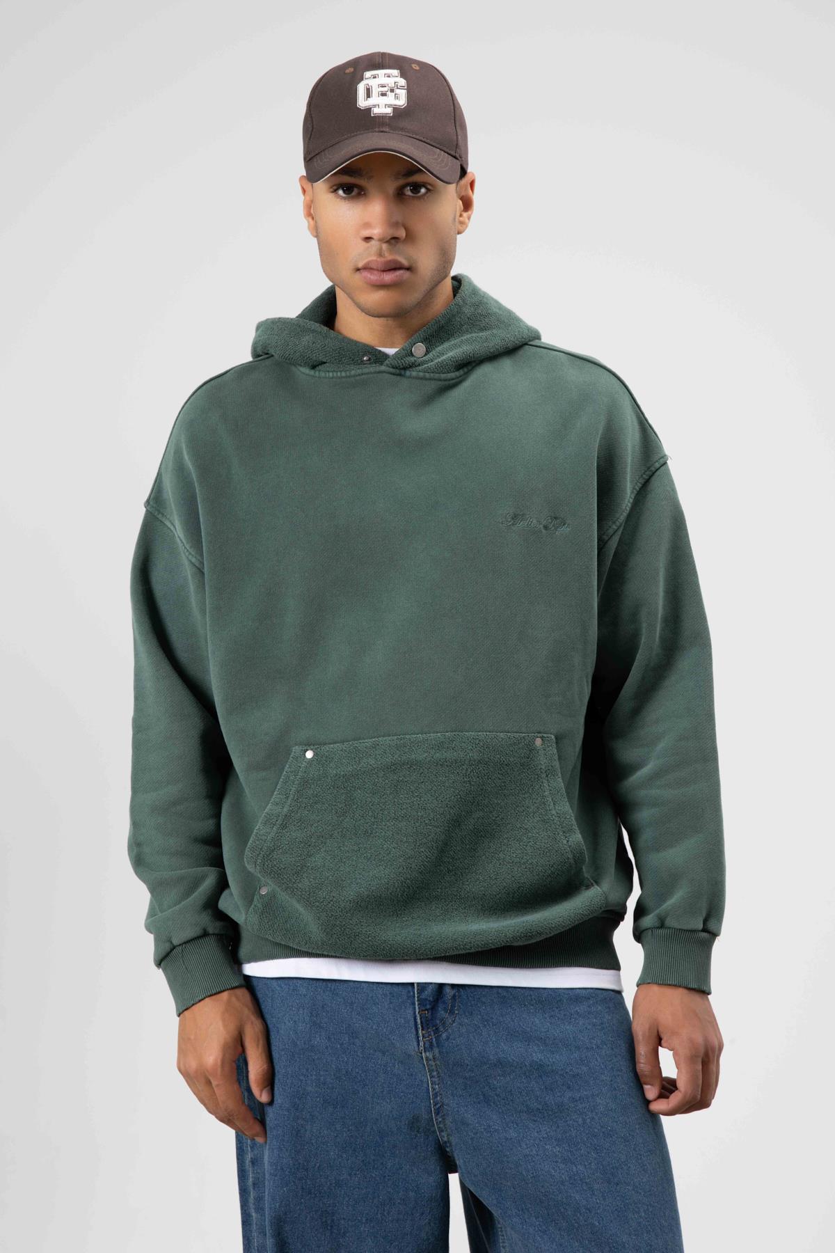 Oversize Yıkamalı Baskılı Kapüşonlu Sweatshirt Koyu Yesıl (V10-62)