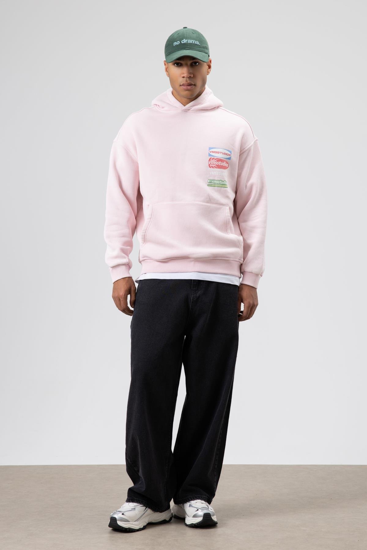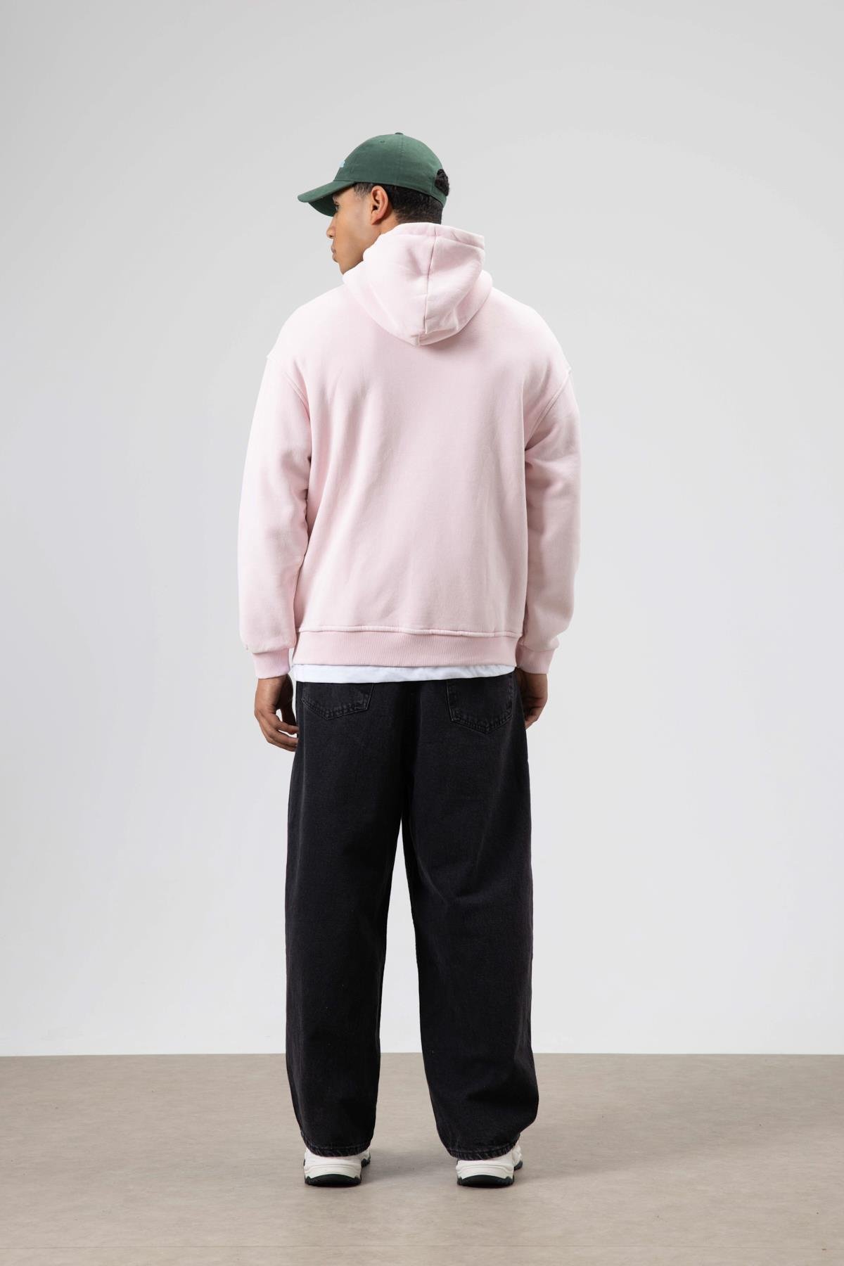 Oversize Yıkamalı Baskılı Kapüşonlu Sweatshirt Pembe (V70-102)