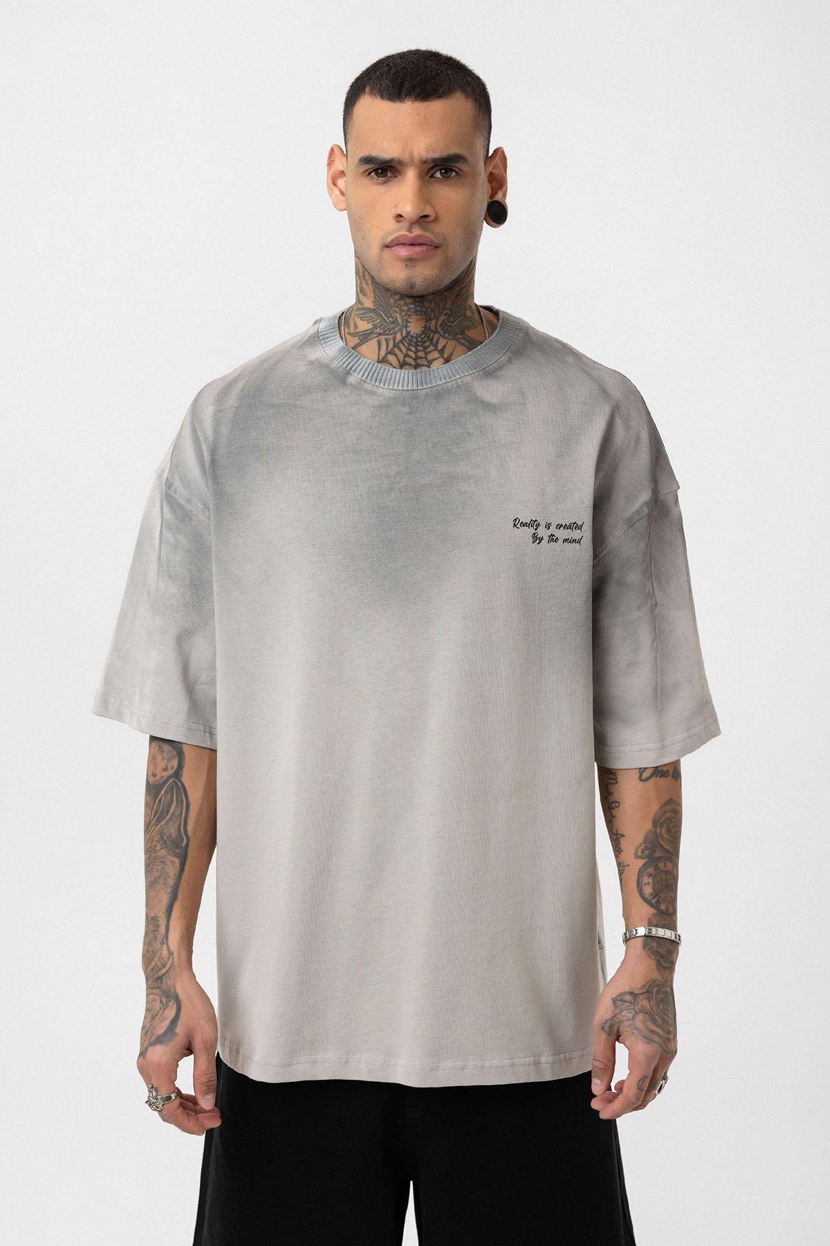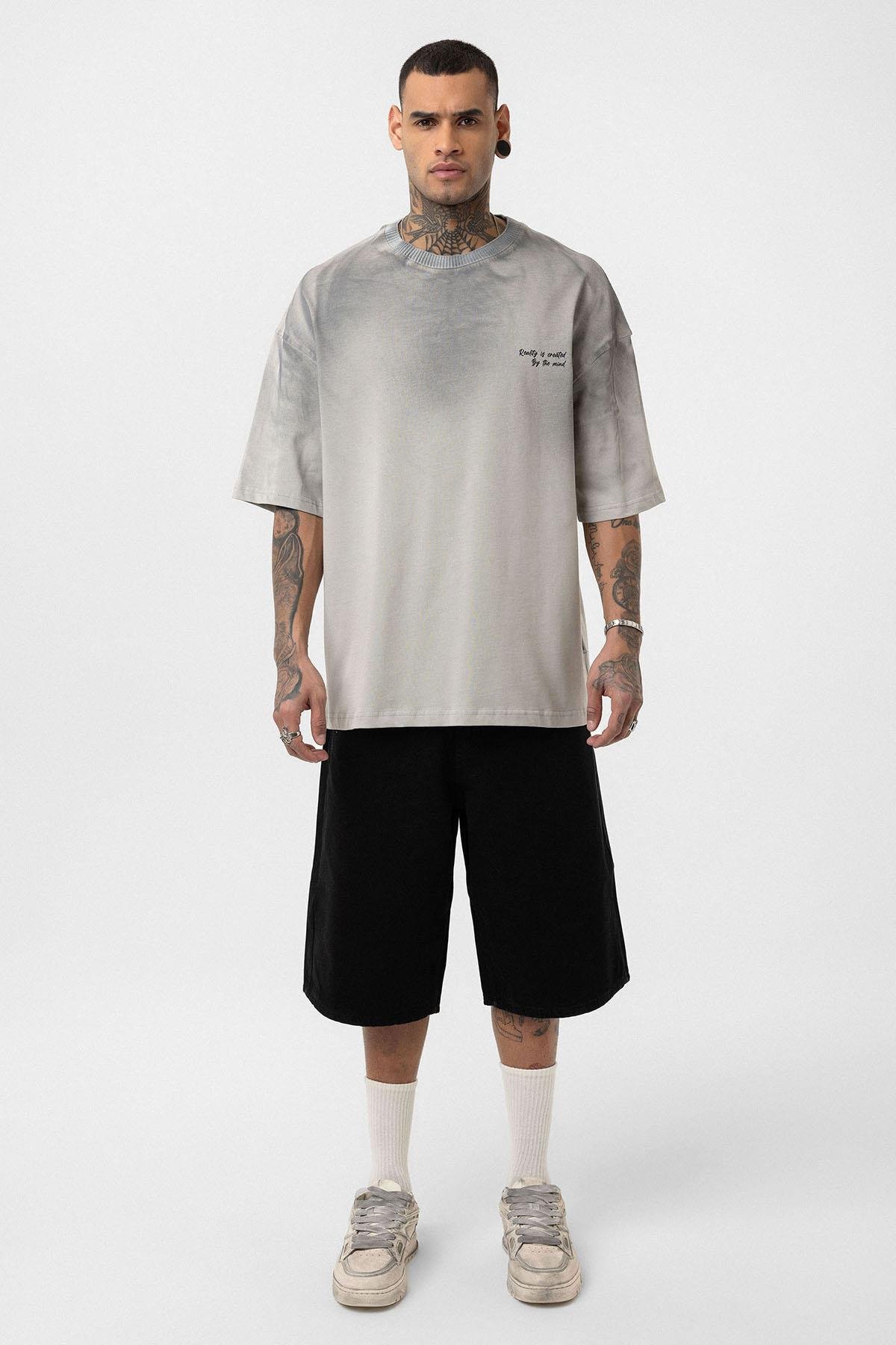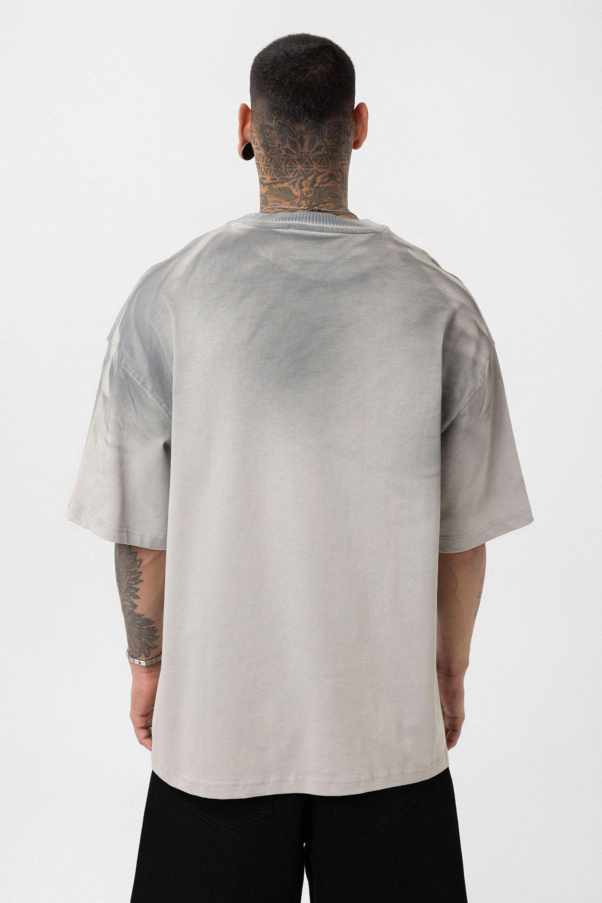 Yıkamalı Yazı Detaylı Oversize Tişört Gri (V70-32)