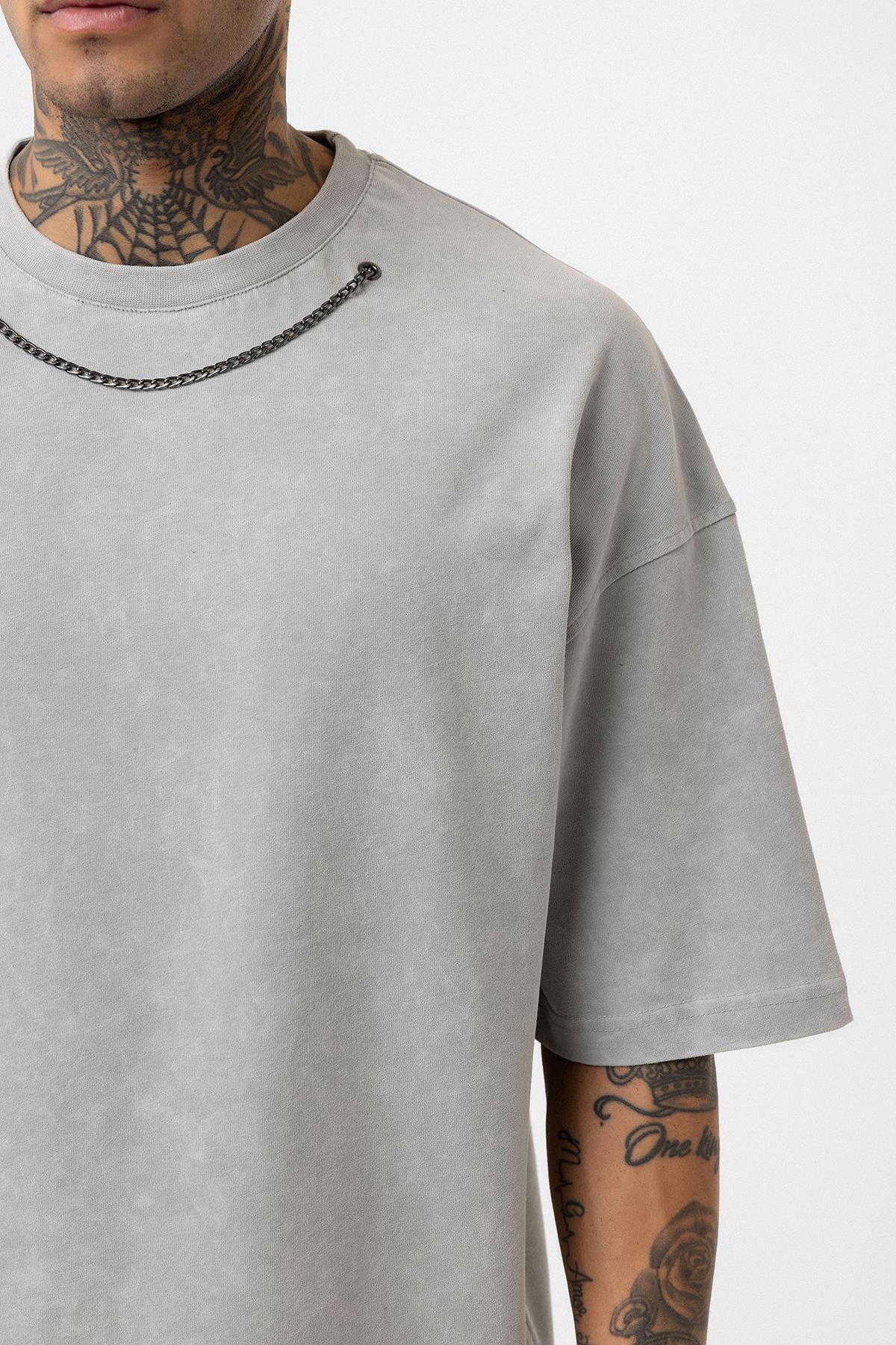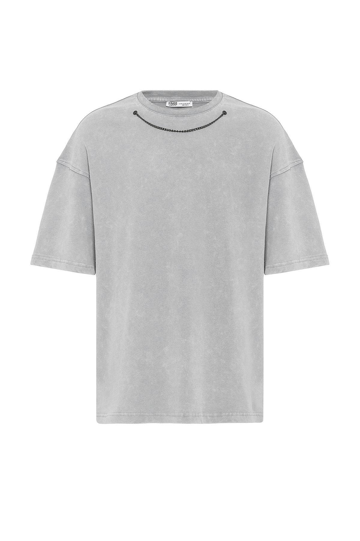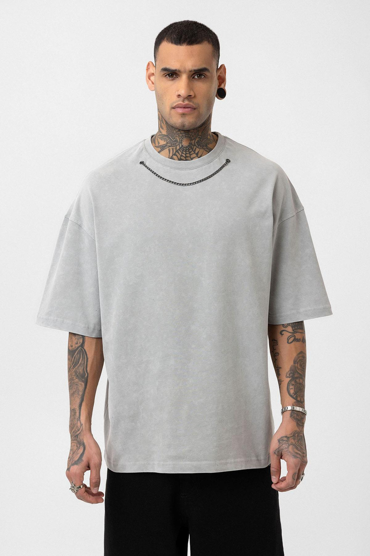 Yıkamalı Zincir Detaylı Oversize Tişört Gri (V70-21)