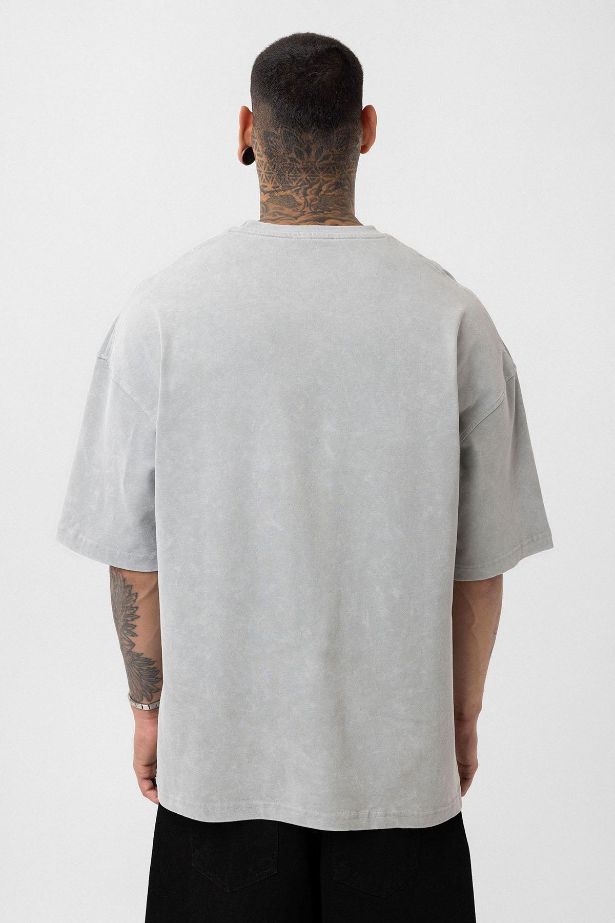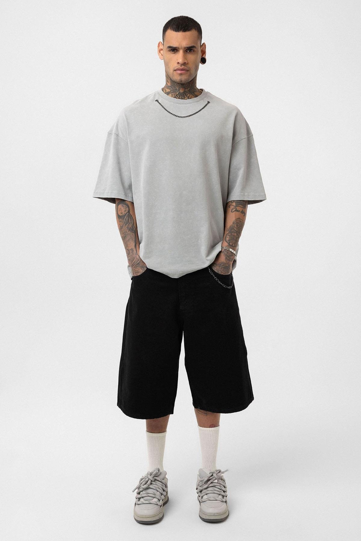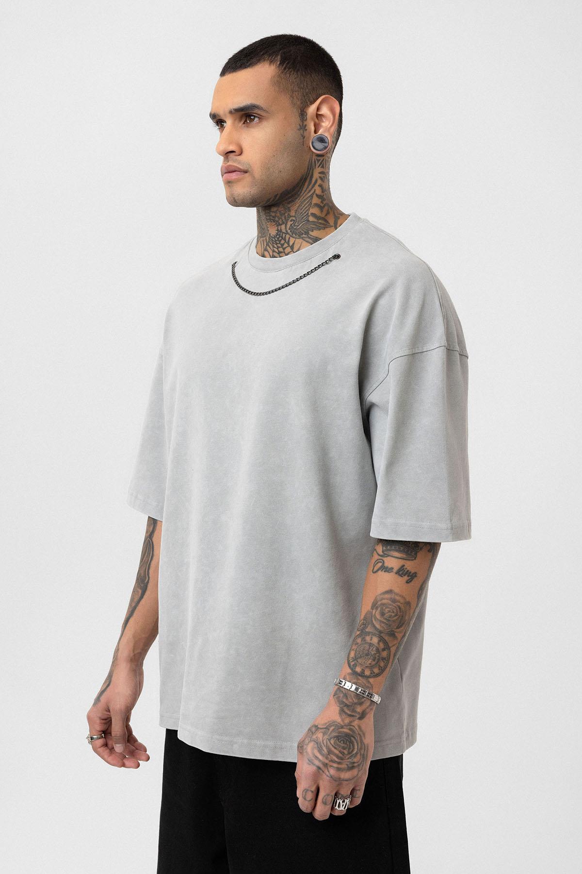 Yıkamalı Zincir Detaylı Oversize Tişört Gri (V70-21)